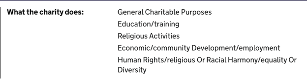 >Consider widening your charitable objectives to issues such as the advancement of education or the advancement of human rights, conflict resolution, or the promotion of religious or racial harmony or equality and diversity.